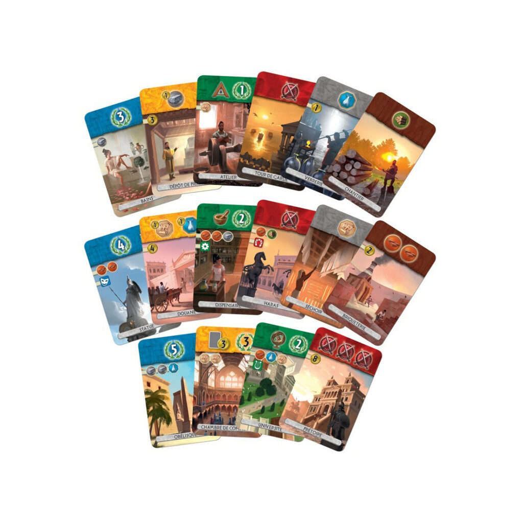 La grande différence vient du choix des cartes: elles sont disposées en pyramide, avec un mélange de cartes visibles et cachées. Vous ne pouvez prendre qu’une carte “libre”, non recouverte. Du coup, le timing est essentiel: chaque prise ouvre des options à l’adversaire… ou les lui bloque. Comme dans le jeu original, une carte peut être construite, vendue contre des pièces, ou utilisée pour édifier une merveille. Chaque joueur dispose de quatre merveilles, mais seules sept seront construites au total, ce qui impose des choix.